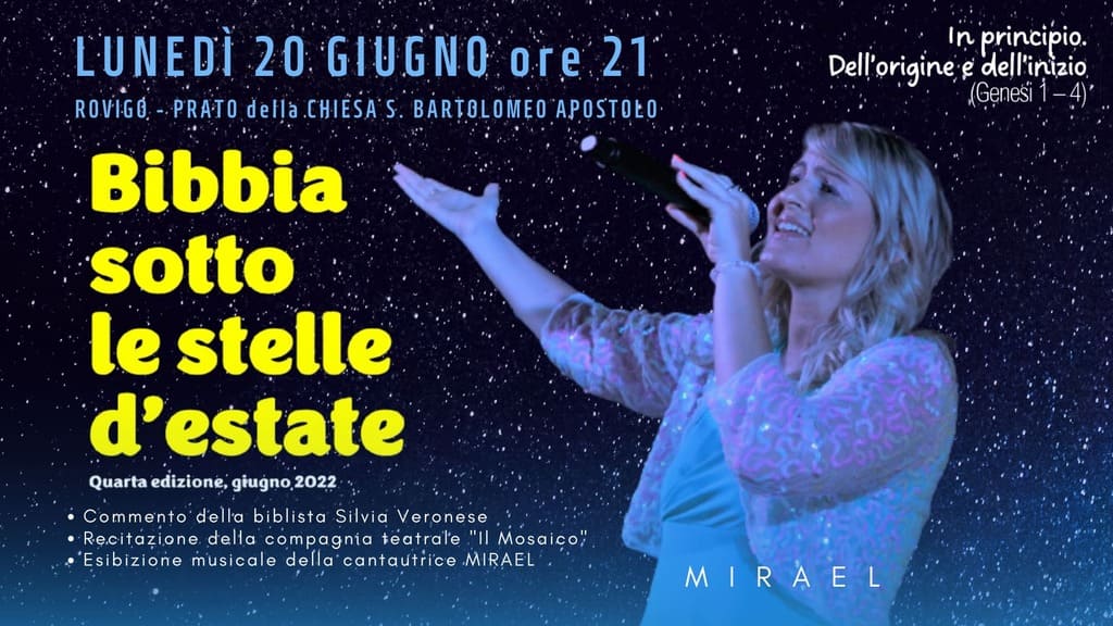 Lunedì 20 Giugno 2022 alle ore 21 a Rovigo nel prato della Chiesa di San Bartolomeo Apostolo (Piazza di San Bartolomeo 1) si terrà la prossima serata della rassegna “Bibbia sotto le stelle d’estate” giunta alla quarta edizione, quest’anno dedicata ai primi quattro capitoli della Genesi e intitolata “In principio. Dell’origine e dell’inizio (Genesi 1- 4)”.